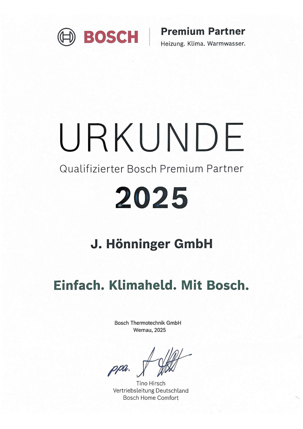 Bei der Josef Hönninger GmbH ist es unsere Mission, zuverlässige und hochwertige Sanitär- und Heizlösungen zu bieten und dabei stets eine persönliche Kundenbetreuung sicherzustellen. Als anerkannter Bosch Premium-Partner verbinden wir traditionelles Handwerk mit moderner, bewährter Markentechnik – für dauerhaften Komfort, Energieeffizienz und höchste Zufriedenheit.